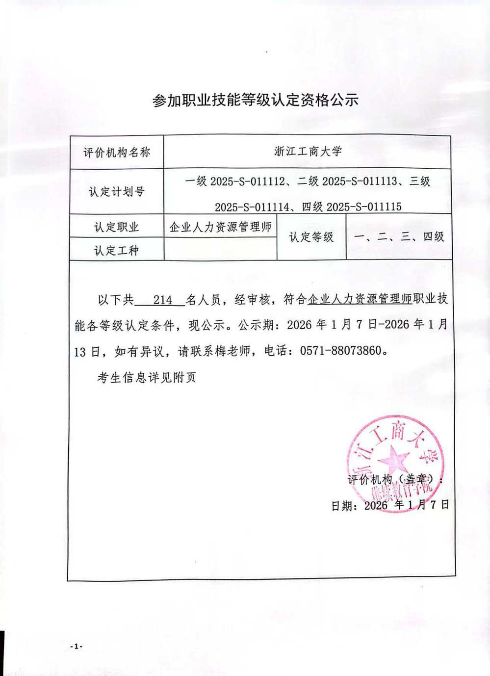 2026年1月参加职业技能等级认定资格公示(企业人力资源管理师).xls