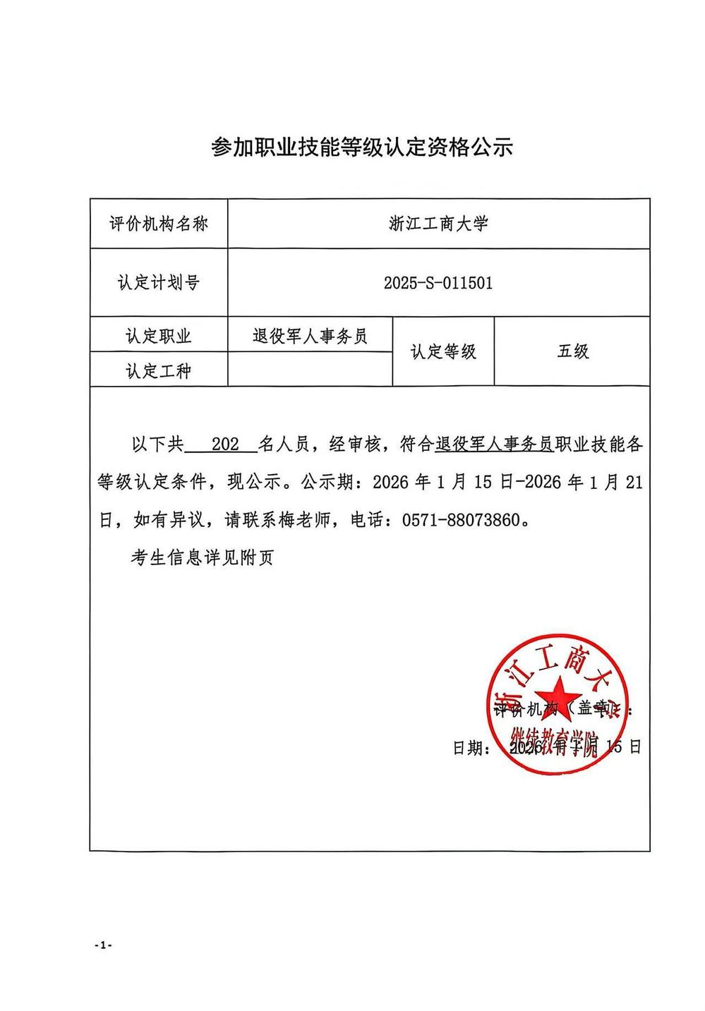 2026年浙江工商大学1月份(永康)退役军人事务员初级工申报计划人员信息审查公示