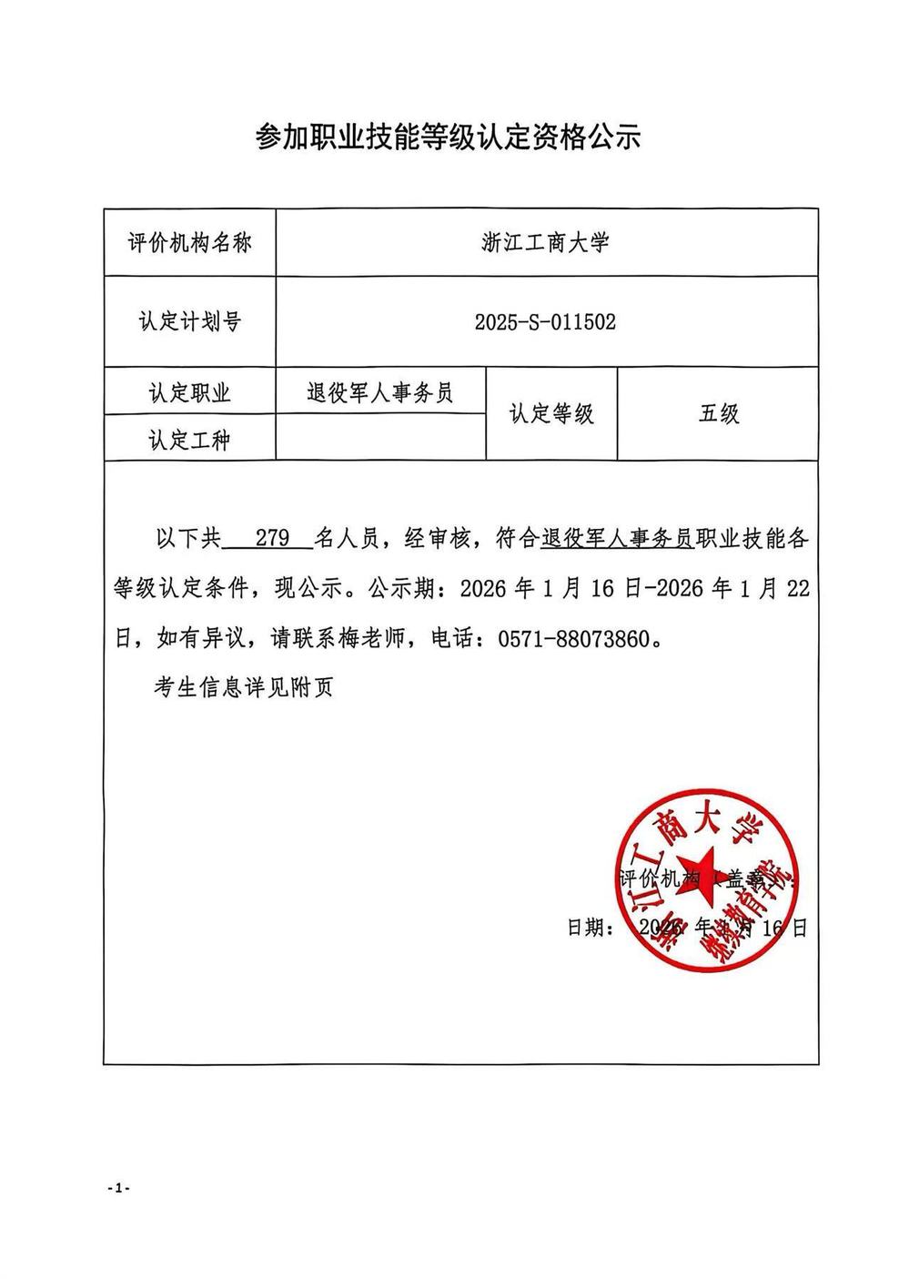2026年浙江工商大学1月份(义乌)退役军人事务员初级工申报计划人员信息审查公示