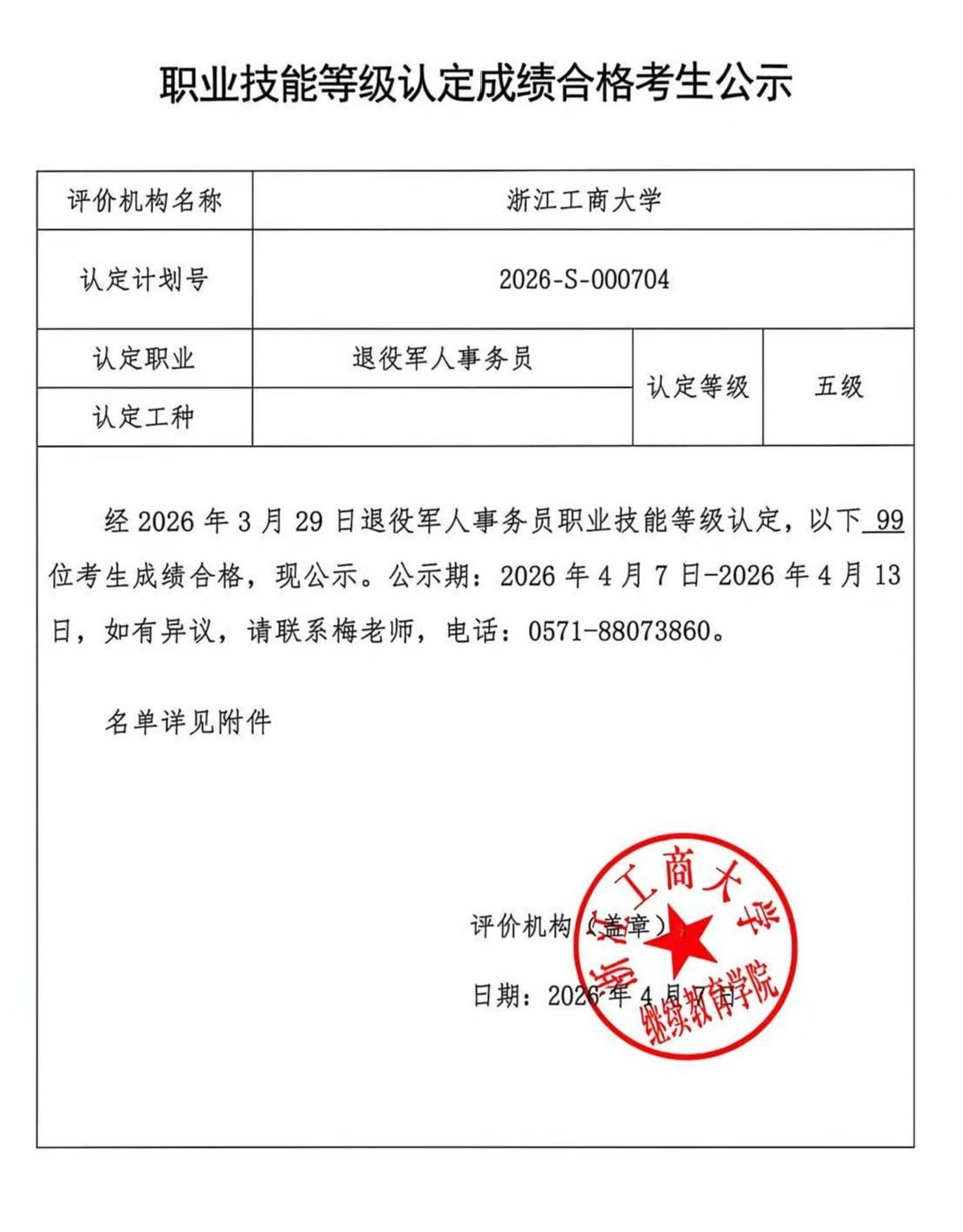 职业技能等级认定成绩合格人员公示(磐安退役军人)